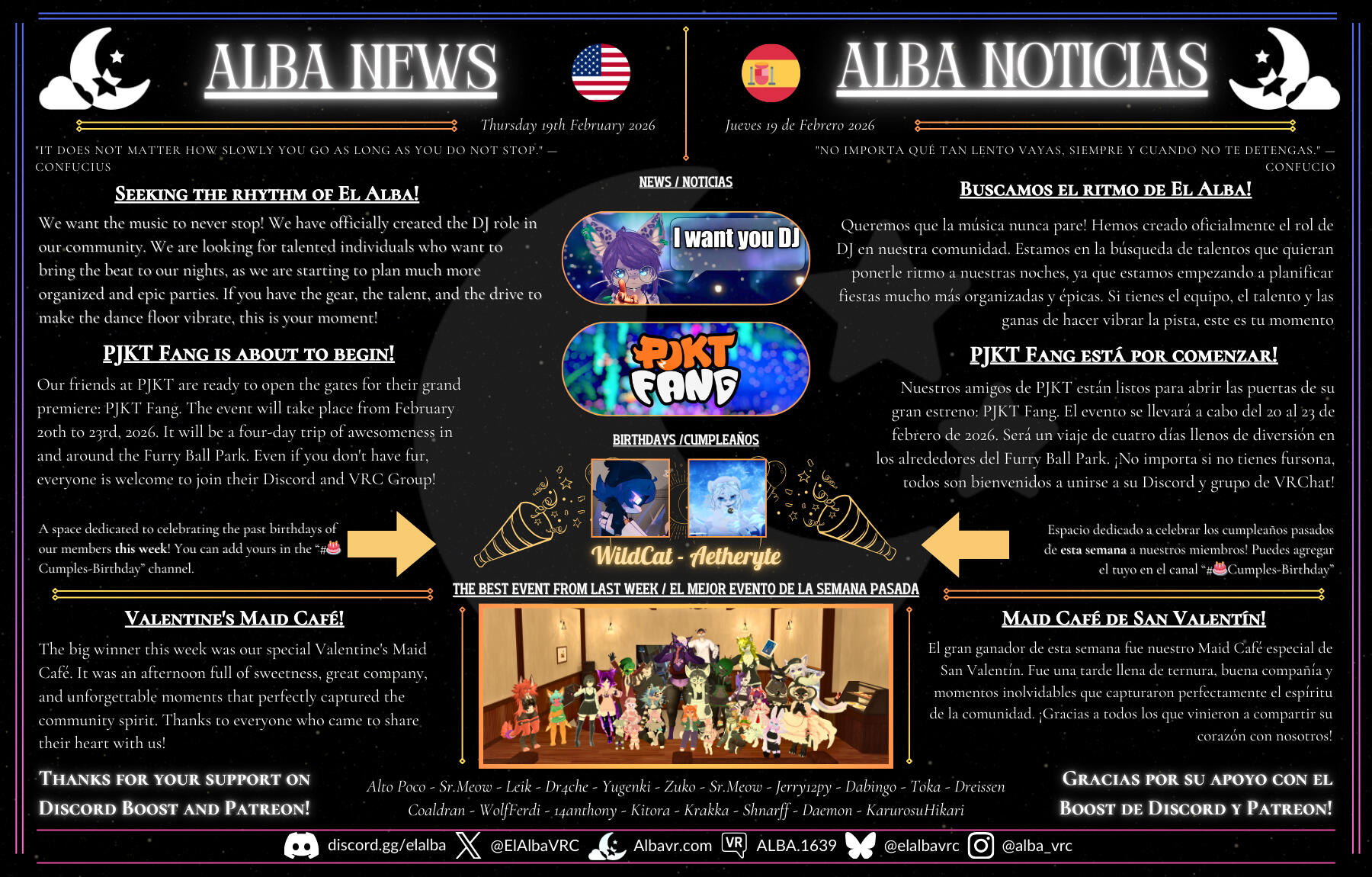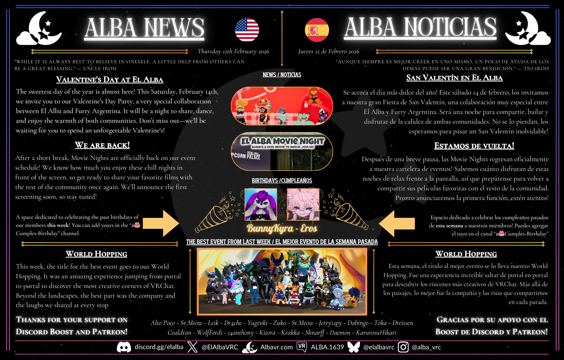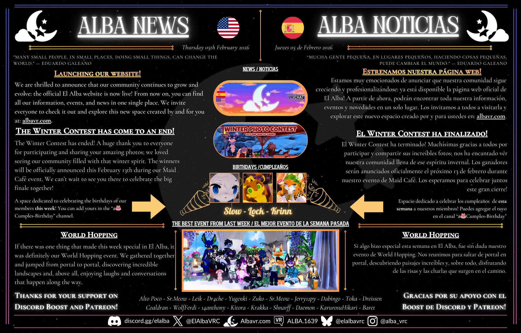 El Alba is a VRChat community dedicated to creating a safe, mature, and conflict-free space. We aim for everyone to express themselves with honesty and consideration, sharing moments and activities in a positive environment. We organize events, maintain an active Discord, and publish a weekly newspaper to strengthen our connection as a community.