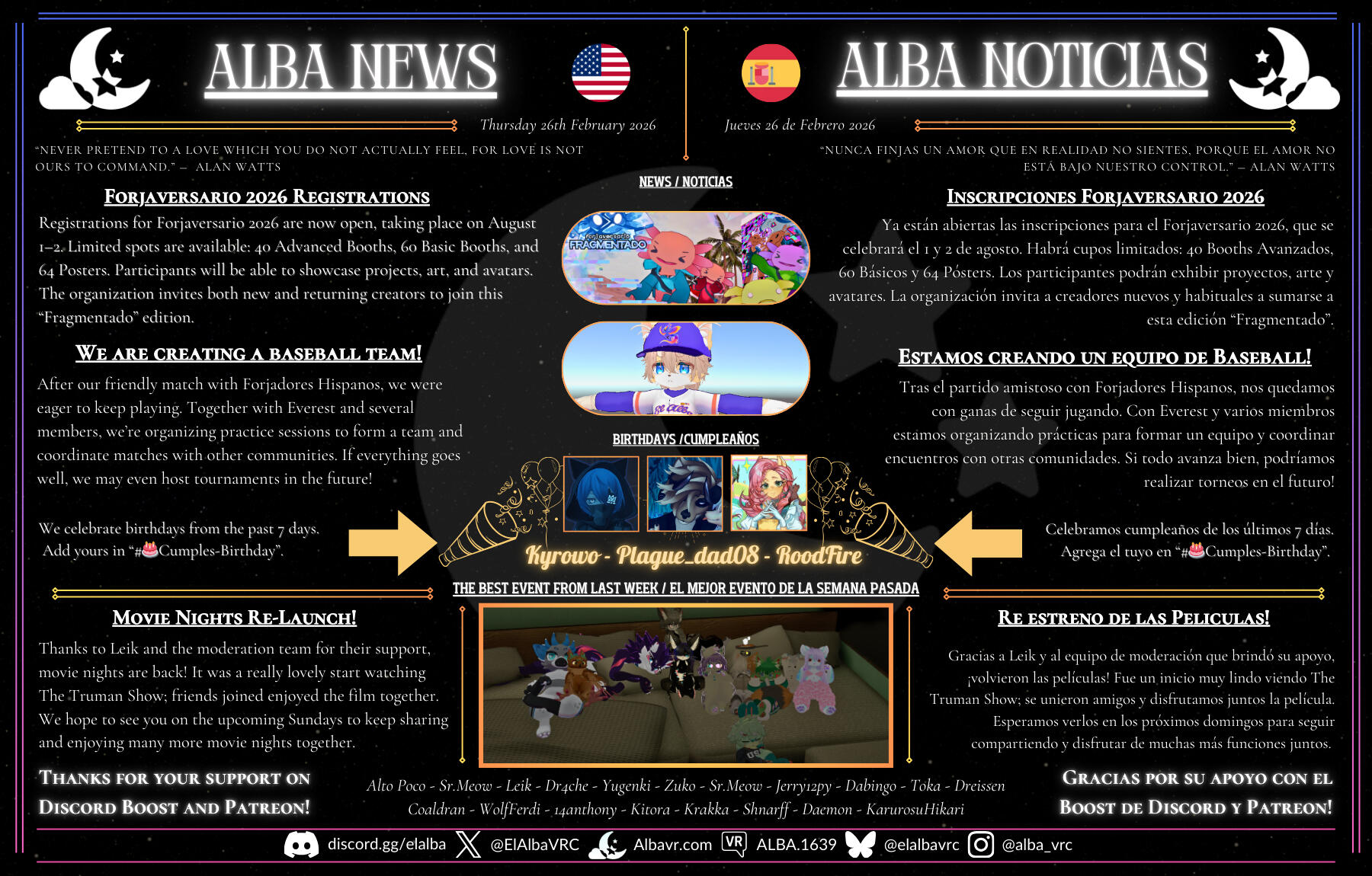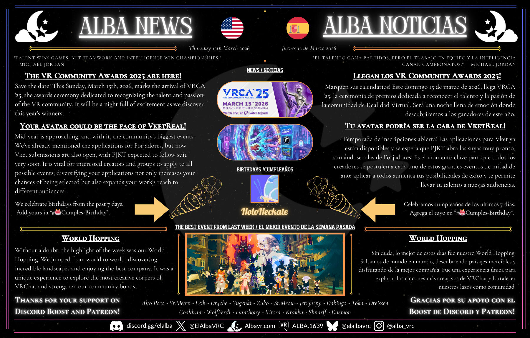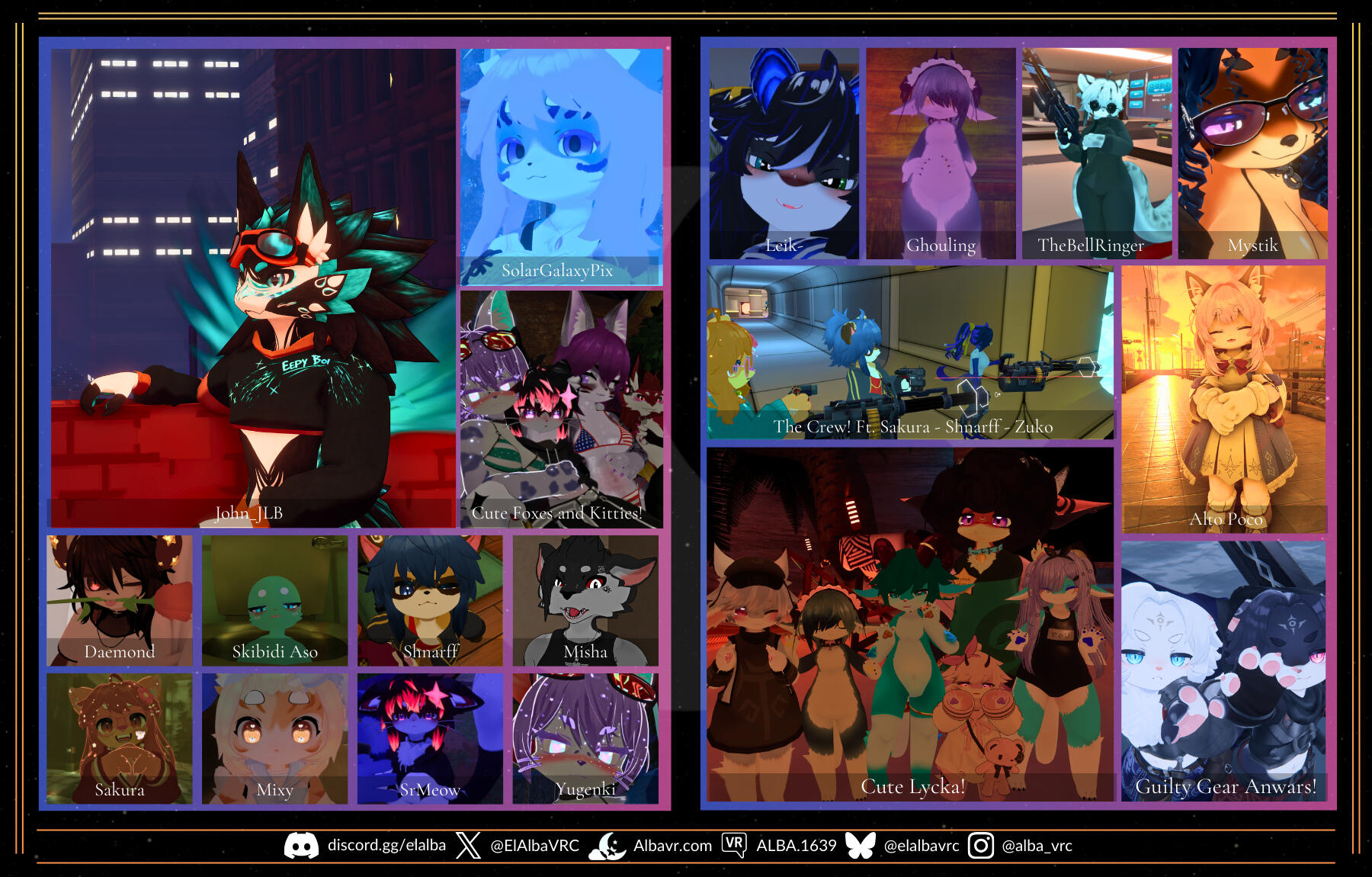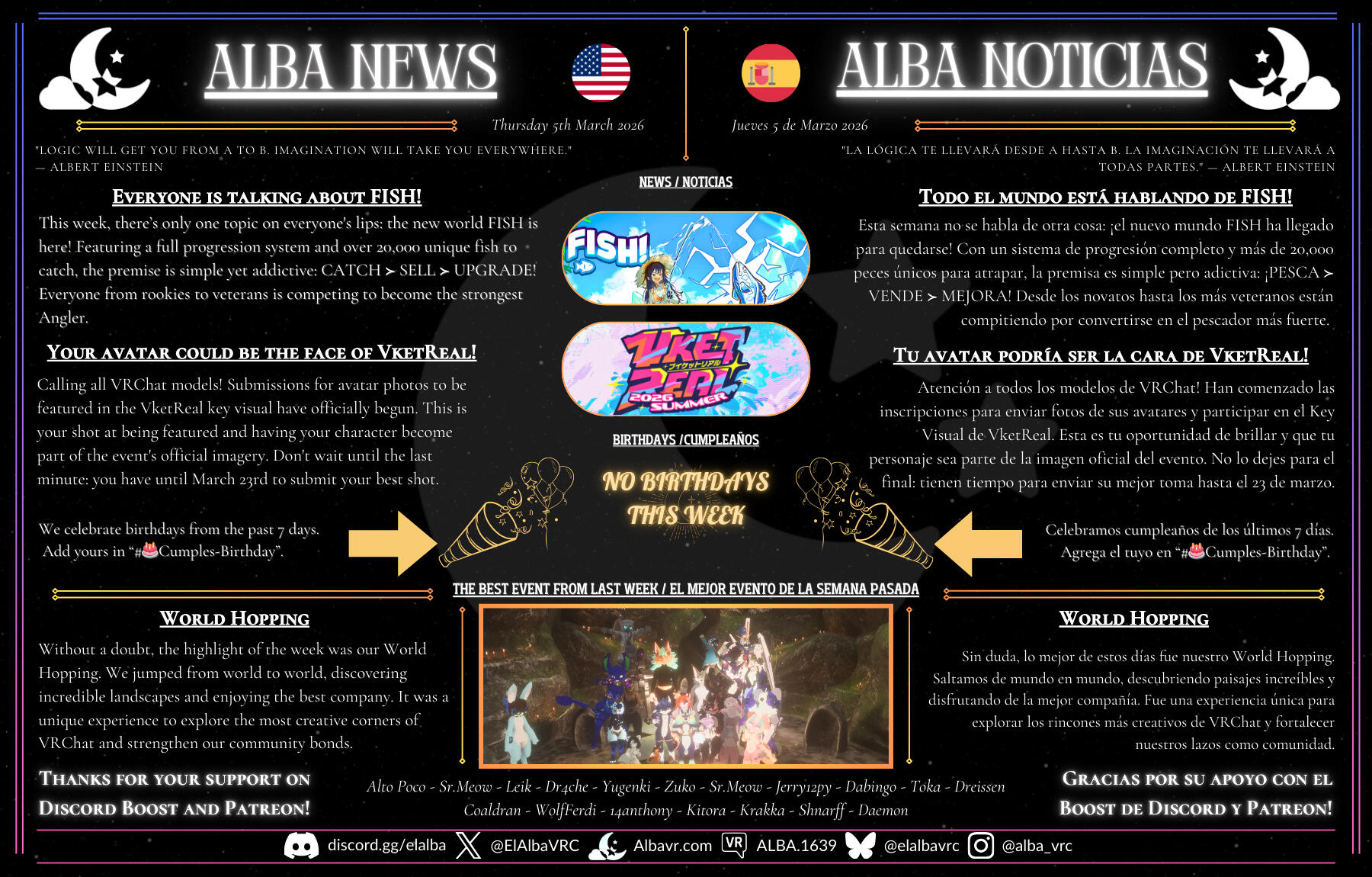 El Alba is a VRChat community dedicated to creating a safe, mature, and conflict-free space. We aim for everyone to express themselves with honesty and consideration, sharing moments and activities in a positive environment. We organize events, maintain an active Discord, and publish a weekly newspaper to strengthen our connection as a community.